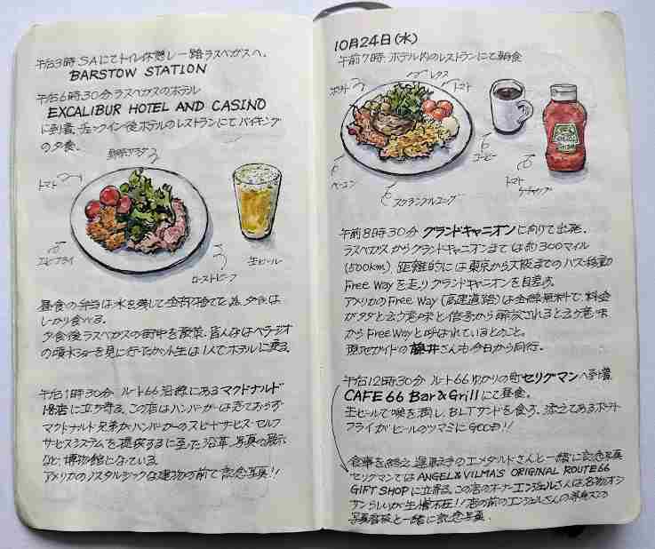 快適なフライトを終えロサンゼルスからは観光バスでラスベガスへ。バスの中で昼食の弁当を受けとる。途中ルート66沿線にあるマクドナルド1号店に立ち寄る。