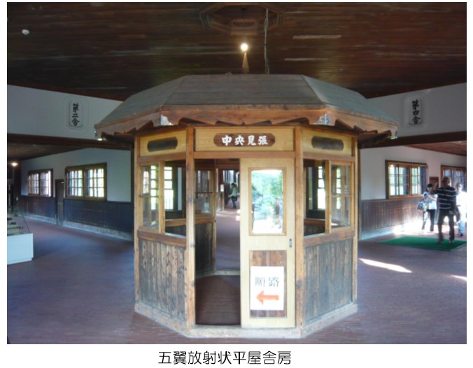 正門をくぐると明治期の官庁建築の庁舎が現れる。5棟が放射状に広がる「五翼放射状平屋舎房」へ。便所が曇りガラスの囲いになっている寒々とした舎房は厳しい牢獄であると一見して分かる。