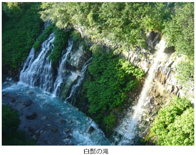 オシンコシンの滝に立ち寄る。オシンコシンとはアイヌ語で川下のエゾ松が群生する所を意味する「オ・シュンク・ウシ」から転じた物との事。山の斜面を斜めに滑り落ちる滝は迫力満点!!