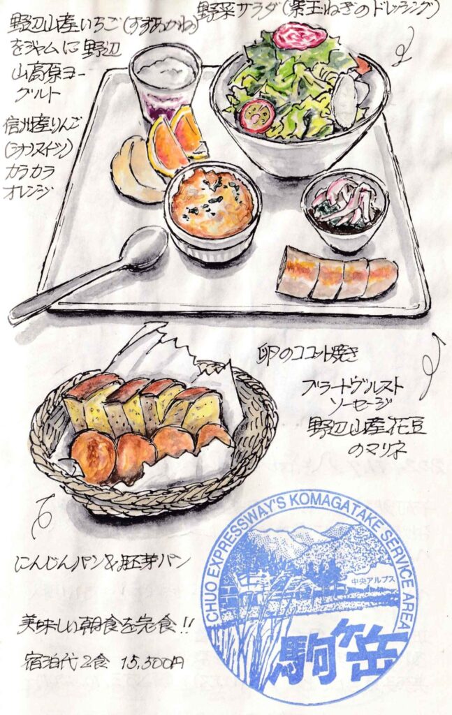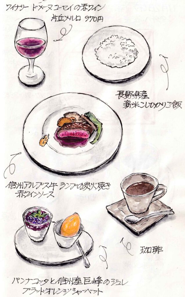 2011年8月5日、初めてペンション「さんかくじょうぎ」に宿泊、食事の美味しさに感激し部屋に置いてあったノートに思わずディナーをスケッチしました。料理一品一品の見た目の美しさ、絶品の美味しさ!!それから何回かお邪魔しておりますが、毎回美味しい食事を楽しんでいます。