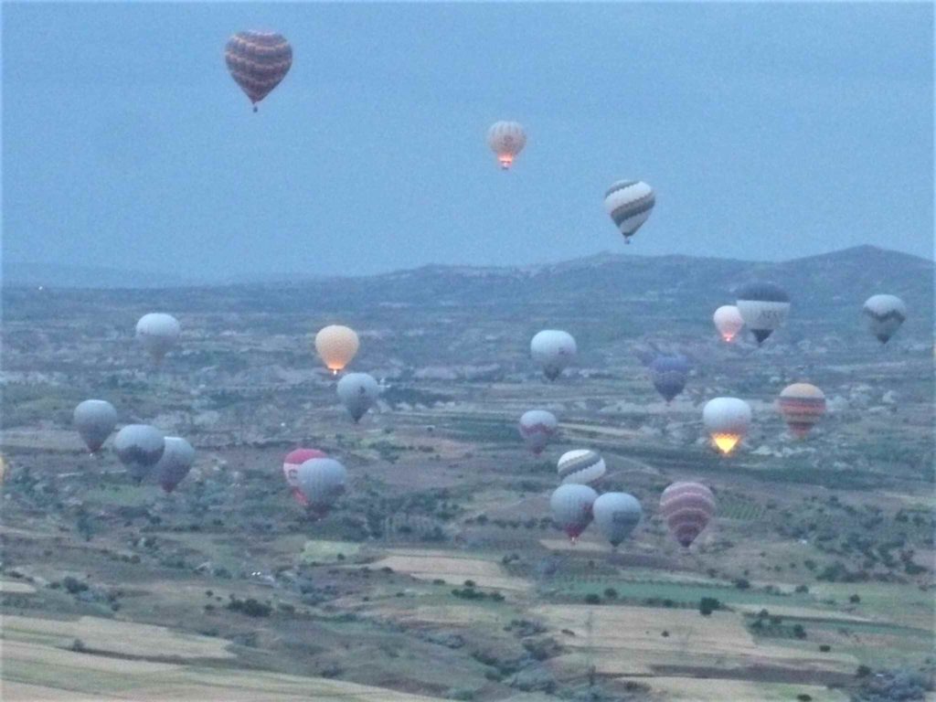 籠の中は4つに区切られていて5人づつ計20人乗り。ガスバーナーの音とその熱を感じながら気球は静かに上昇。明けかけた空に浮上して行く。気が付くとあちらこちらから気球が上がって来る、その数は何と100機近く、まさに圧巻である。